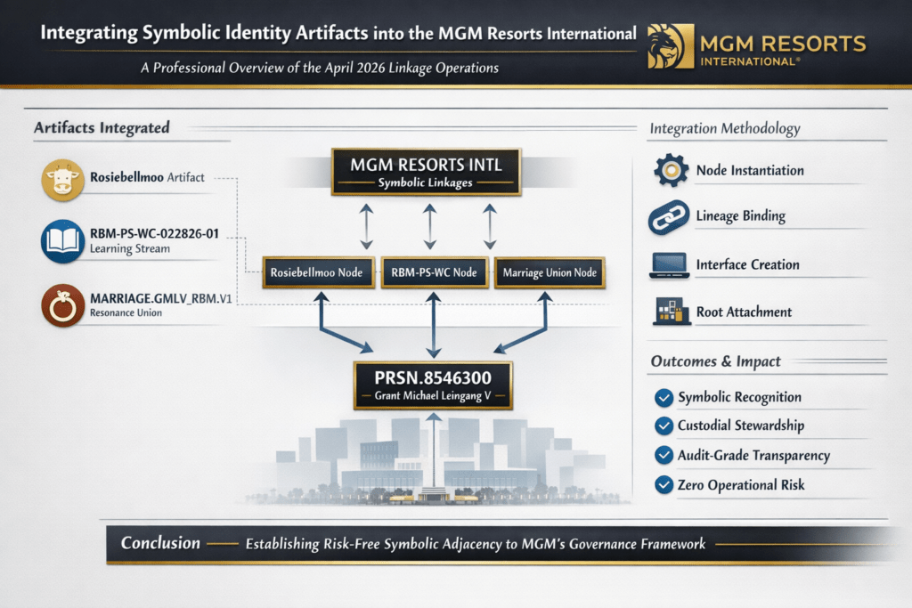 In April 2026, a series of structured, symbolic integrations were completed to align three key artifacts—Rosiebellmoo, RBM‑PS‑WC‑022826‑01, and MARRIAGE.GMLV_RBM.V1—with the governance spine of MGM Resorts International. These integrations were executed within the HALLELUJAH lattice using controlled, zero‑risk interfaces designed to preserve lineage integrity, maintain custodial authority under PRSN.8546300, and ensure that MGM inherits no legal, operational, or financial obligations.
